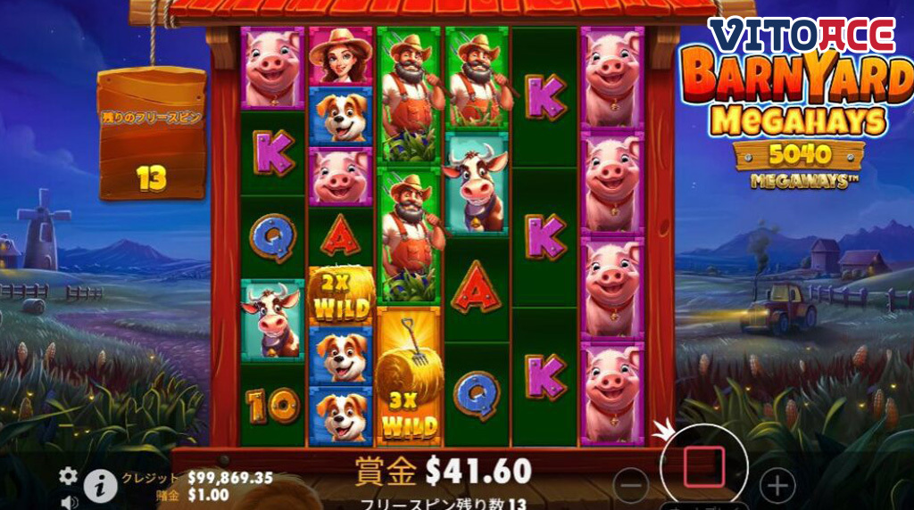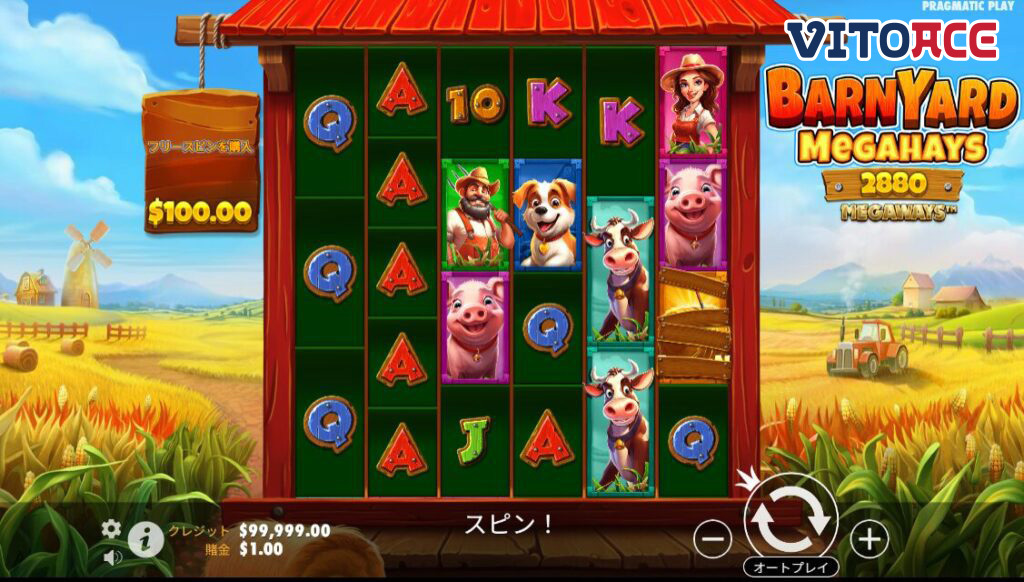 バーンヤード・メガヘイズ・メガウェイズ(Barnyard Megahays Megaways)は、Pragmatic Play社から4月18日にリリースされたオンラインカジノスロットで、健全な農場で幸せで笑顔の動物たちが豊かに育っていくというテーマです。農場に足を踏み入れると、緑豊かで暖かく晴れた日に赤いトラクターが煙を吐き、トウモロコシがはじけ、農産物は豊富に収穫されていき、それをおいしそうに食べる動物たちという現代社会に疲れた人に刺さるのではないでしょうか?