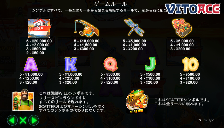 高配当のシンボルは船、ロッド・トンボ・ツールボックス四種。「A・K・Q・J・10」と数字・アルファベットが書かれたシンボルの方が低配当です。各シンボルの配当は、以下の通りです。(1.00ドルに対して獲得できるドルの額です)