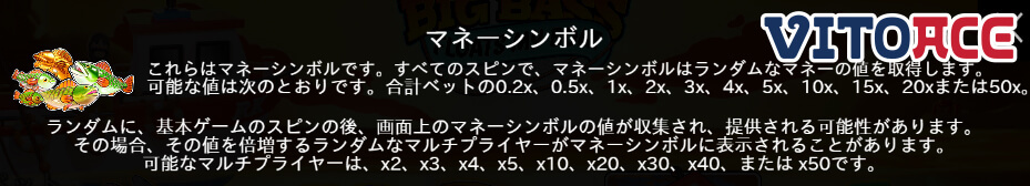 Big Bass Floats My Boatには通常シンボル、ワイルドシンボル、SCATTERシンボル、マネーシンボルの3種類のシンボルがあります。ワイルドシンボルはSCATTERとマネーシンボルを除く、全てのシンボルを代わることができます。
