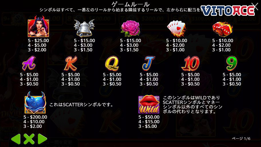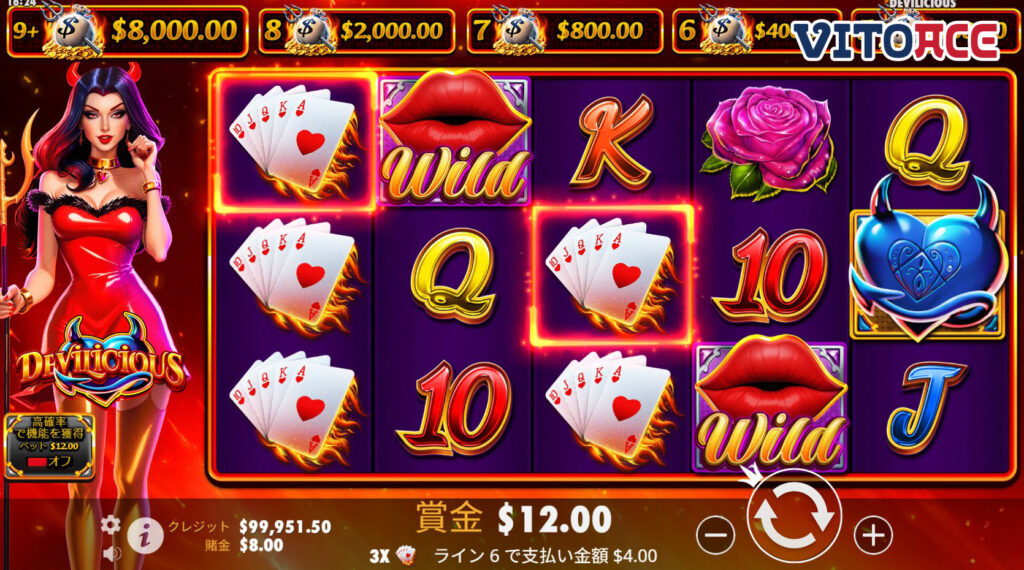 デビリシャス(Devilicious)は、小悪魔の美女がリールの横で進行する高ボラティリティスロットです。投げキッスで追加されるWILDやWILDの出現で、ベースゲーム中はコツコツと稼ぎましょう。フリースピンではキャッシュシンボルの値が増加し、一撃配当のチャンスが広がります。燃えるような熱い勝利を探しに、この楽しい5×3スロットをぜひお試しください。最大1,000倍の配当が期待できるベースゲームの9つのマネーバッグシンボルや、リスピン機能、フリースピンラウンドがこのゲームの魅力です。フリースピン中には最大20回のフリースピンと2倍または3倍のマルチプライヤーがホイール・オブ・フォーチュンで与えられ、悪魔のキスで追加のWILDがリールに登場します。熱い勝利の可能性を感じながら、Deviliciousでのスリリングな体験を楽しみましょう!