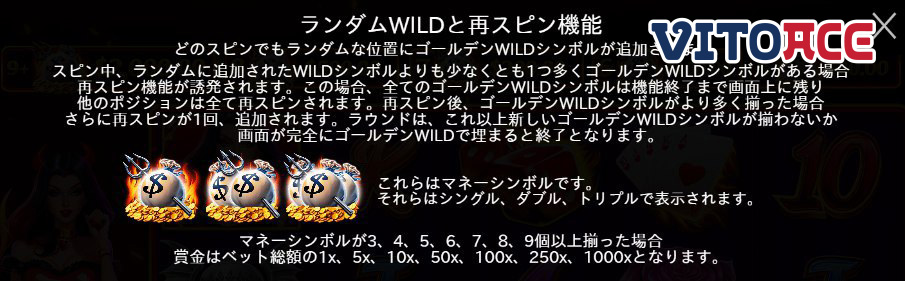 マネーシンボルはシングル、ダブル、トリプルシンボルとして登場します。ベットの1倍、5倍、10倍、50倍、100倍、250倍、または1000倍の賞金が、それぞれ3個、4個、5個、6個、7個、8個、9個のマネーシンボルを揃えることで獲得できます。