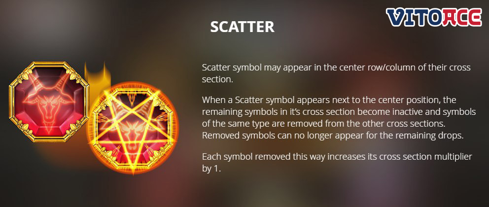 スキャターはクロスの中央列または行に出現します。中央付近に止まったスキャターにより、同じクロス内の残りのシンボルが非アクティブ化され、同種のシンボルが他のクロスから消去されます。残りのカスケードでは消去されたシンボルは出ません。消去された1シンボルごとに、そのクロスの乗数が+1されます。