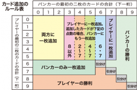 オンラインカジノでは、画面左側が「プレイヤー」右側が「バンカー」に設定されているゲームがほとんどです。(プレイヤーとお店側と間違えがちですが、そのような意味はなく便宜的な言い方なので、どちらにBETするのかとイメージできれば深く考えなくても大丈夫です!)Betが完了すると、まずは双方に2枚ずつカードが配られます。状況によりエクストラカードと呼ばれる追加カードが配られて、その合計が9に近いほうが勝利となり勝利金を獲得することができます。「最大3枚も配ったら簡単に9なんて超えてしまうのでは?」って疑問を抱く方もいると思いますが、バカラの数字の数え方は10の位は常に切り捨てで計算します。なので、15は「6」、23は「3」とみなします。そのため、カードの10/J/Q/Kの4種類は「0」になります。(例)プレイヤー 3/1/J 合計4バンカー 2/2/5 合計9 となり、この場合バンカーが勝利となります。・カードの追加条件
