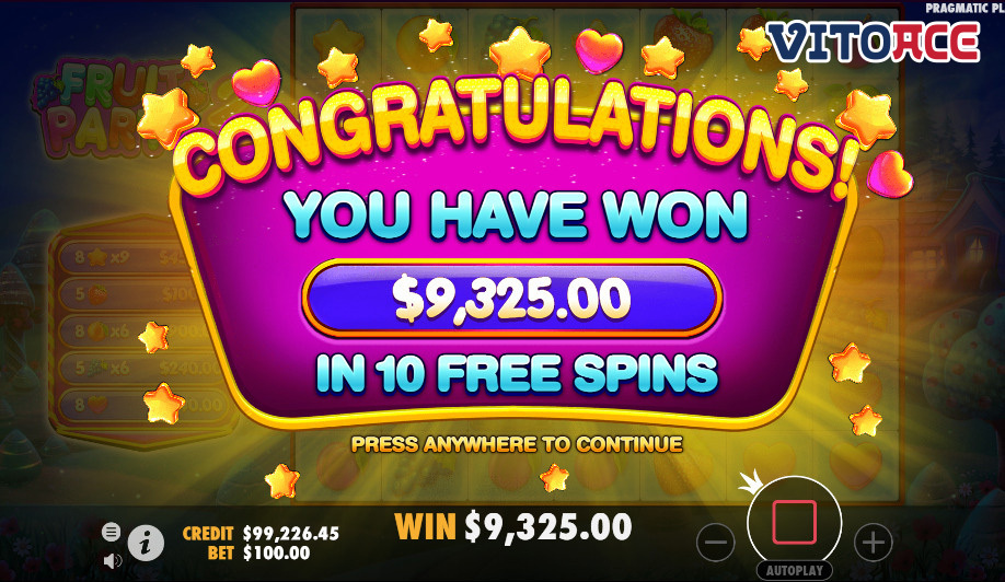 SCATTERシンボルが3つ以上停止するとフリースピン獲得です。 SCATTERシンボルの数によって、 以下のとおりフリースピン回数が異なります。フリースピン中に再びSCATTERシンボルが3つ以上停止すれば、さらに追加スピン5回分がもらえます。なお、フルーツパーティ2には、フリースピンの購入機能も搭載されているのが特徴です。通常ゲームで遊ばずに、手っ取り早くフリースピンを獲得したいときは活用しましょう。最大729倍のマルチプライヤー付きワイルドでBIG WIN獲得!?