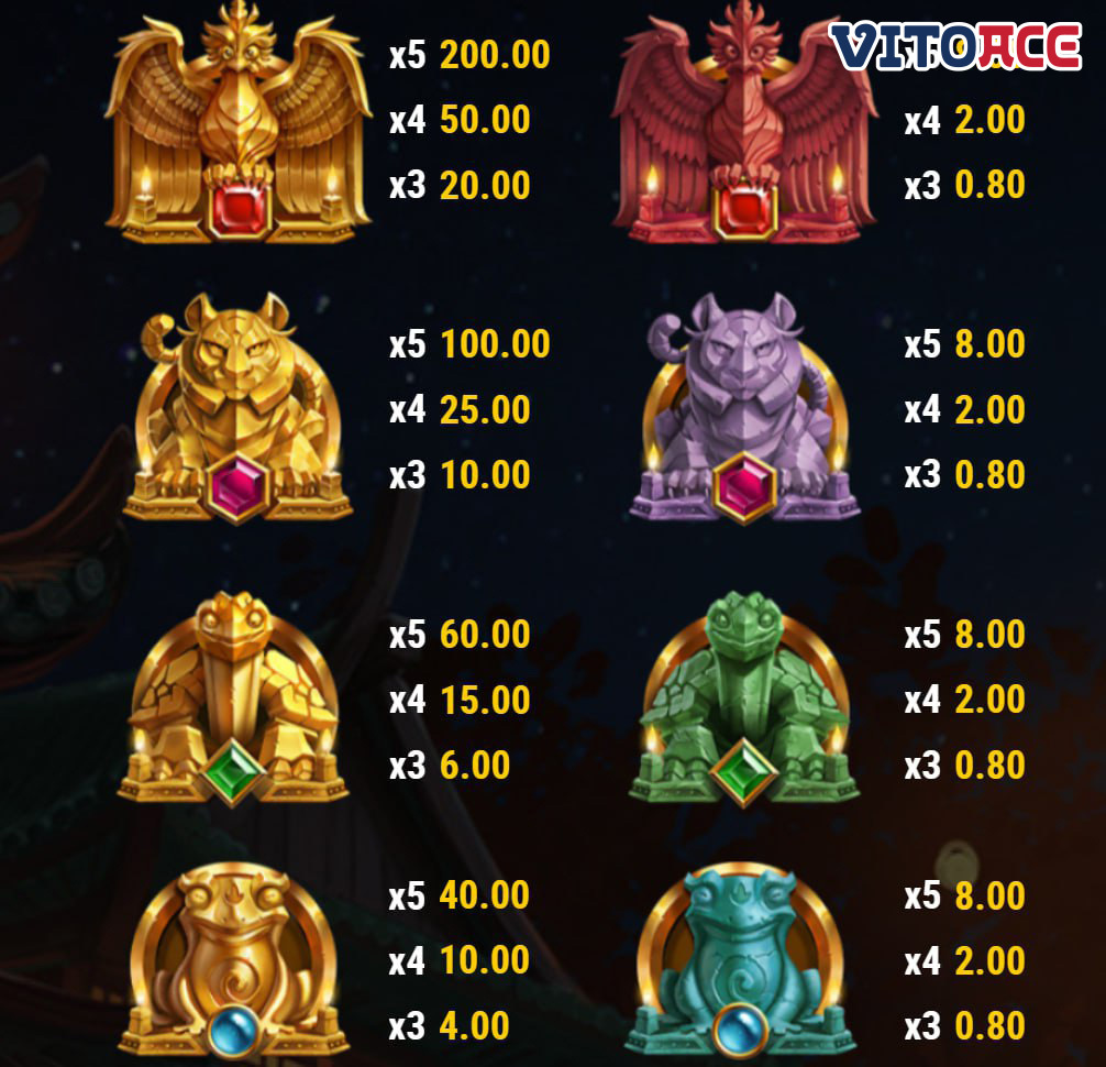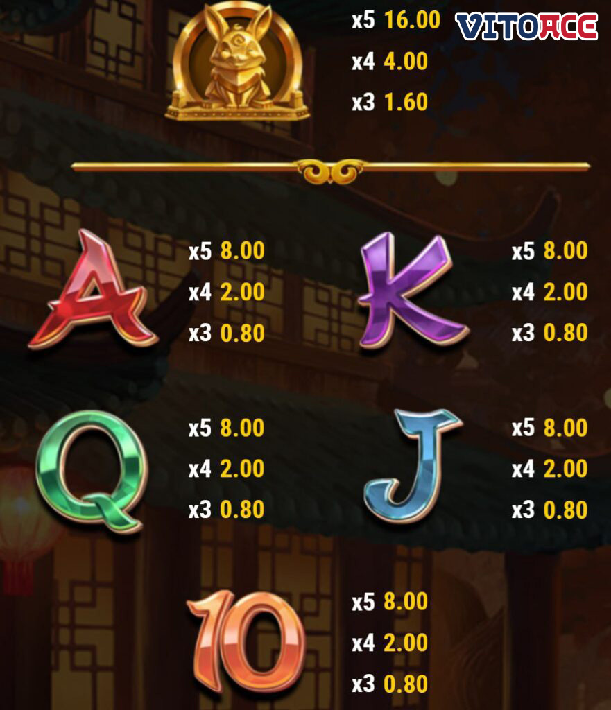 同じシンボルタイプの 5 つが着地すると、配当は5 倍になります。より高額なシンボルは、ターコイズのカエル、緑のカメ、紫の虎、赤い鳥です。同じシンボル タイプの 5 つが着地すると5 倍の配当が支払われ、高配当シンボルのゴールデン バージョンの支払いは25 倍から 125 倍になります。黄金のウサギが 5 つ着地すると、支払いは 10 倍になります。