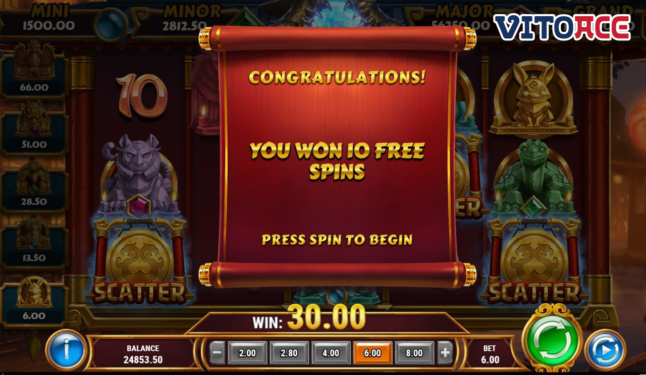 この機能は、3 つ以上のスキャッター シンボルを着地させるとトリガーされ、10 回のフリー スピンが付与されます。 3 つ、4 つ、または 5 つのスキャッター シンボルを着地させると、それぞれ 5 倍、10 倍、または 50 倍の直接支払いが与えられます。 3 つ以上のスキャッター シンボルを着地させるとこの機能を再トリガーでき、追加のフリー スピンが 10 回付与されます。