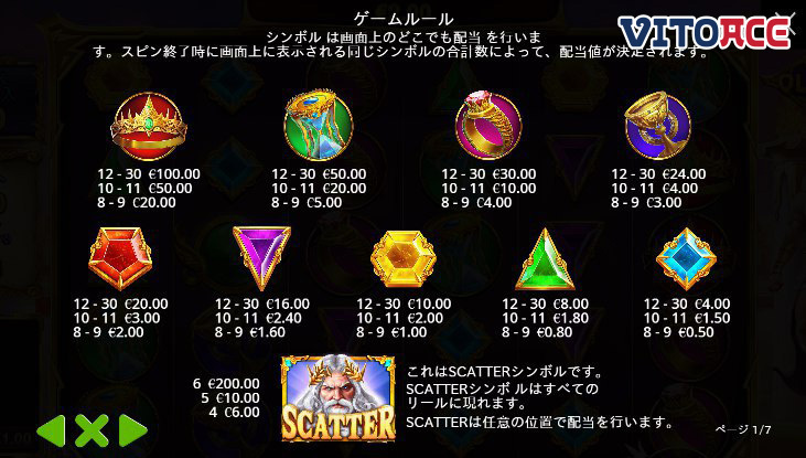 - ゼウススキャッターシンボル:ペイライン5で1,000,000を獲得。