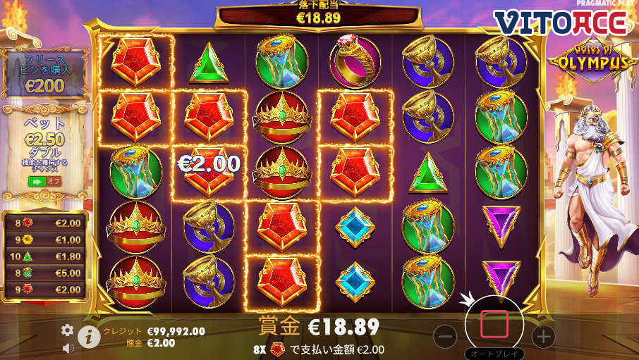 最大倍率5,000倍の獲得が目指せるGates of Olympus(ゲート・オブ・オリンパス)はベースゲーム中はあまりランダムマルチプライヤーは発動しません。ポイントとなるのがやはりフリースピンモードで連続してランダムマルチプライヤーが発生することもあり、登場するマルチプライヤー次第で一気に高配当を狙うことが出来ます。ベット額の100倍を支払ってボーナス購入機能からのフリースピンに突入する価値は十分にあります。ランダムな値のマルチプライヤーが付くという機能としてはシンプルなものとなっていて遊びやすいのでぜひともVITOACE (ヴィトエース)で挑戦してみませんか?
