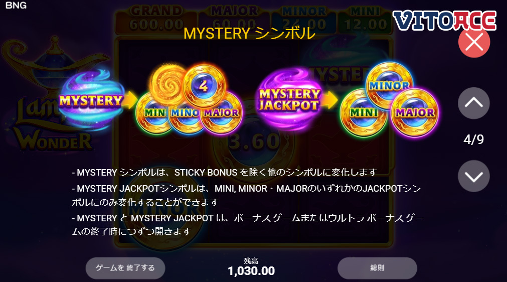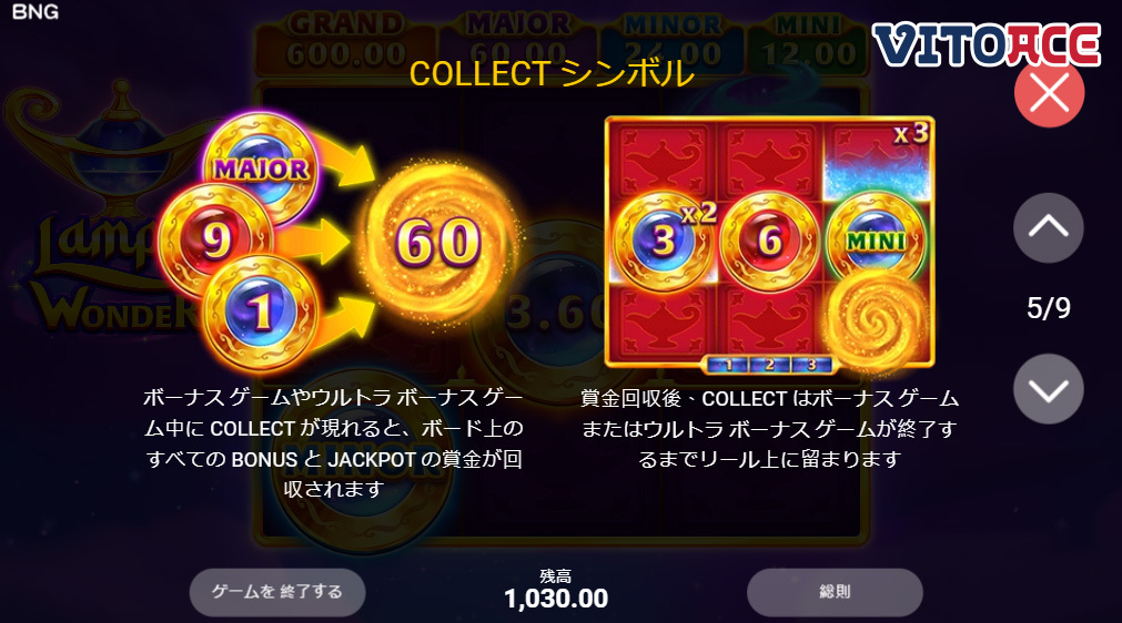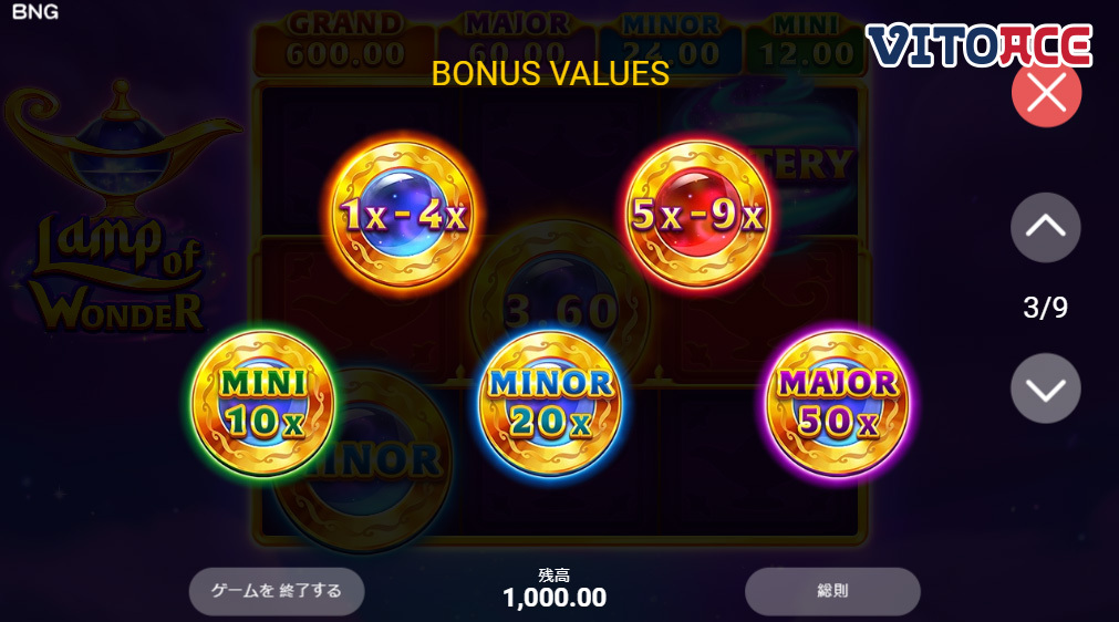 夜の砂漠に煌めく星空の下、アラビアンナイトの魔法の世界が広がっている。BNGの「ランプ・オブ・ワンダー」で、あの伝説の魔法のランプを手に入れろ! 「HIT THE BONUS」の興契メカニックや多彩な機能が詰まった、ワクワクのゲーム体験が待っている。VITOACE (ヴィトエース)でアラビアの夜の魔法に酔いしれるチャンスをお見逃しなく!Lamp of Wonderのシンボル