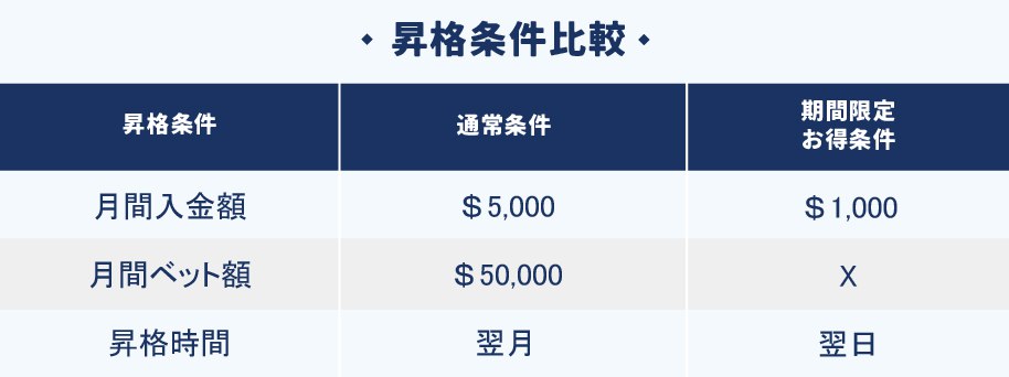 当月に合計$1,000以上ご入金後にご申請いただければ、翌日すぐに二星への昇格となり、レベルアップアップボーナスをご獲得いただけます!昇格条件比較