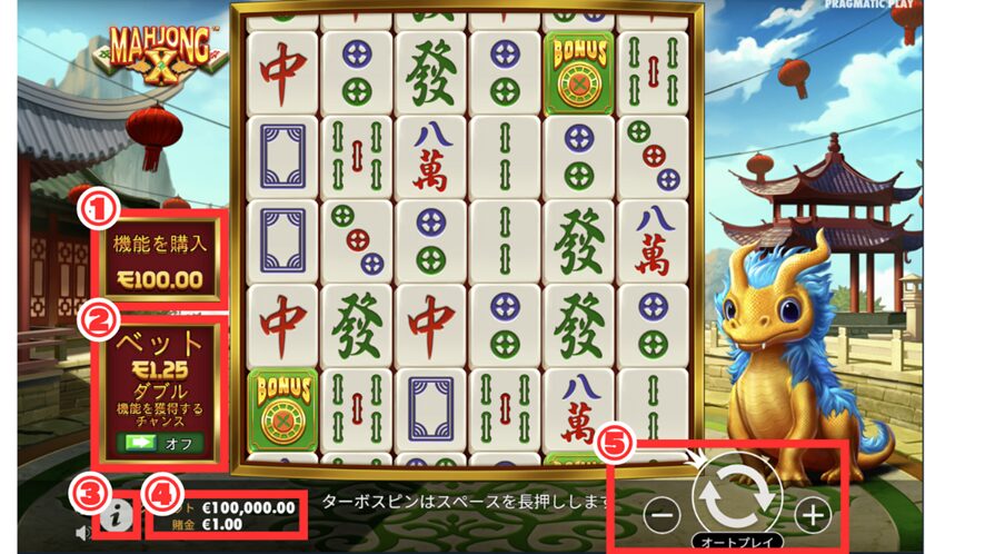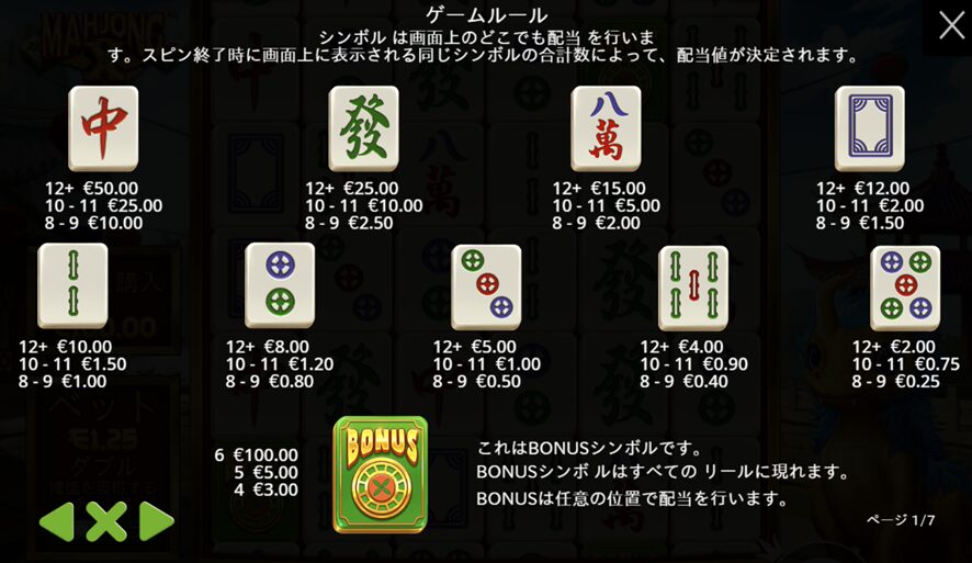 Pragmatic Play社より2024年6月に麻雀をモチーフにして作成されたオンラインカジノスロットです!プラグマお得意の、8個以上盤面に登場させて配当を発生させ、その最終配当に盤面に登場したマルチをかけてくれるタイプです(SWEET BONANZA方式)配当表