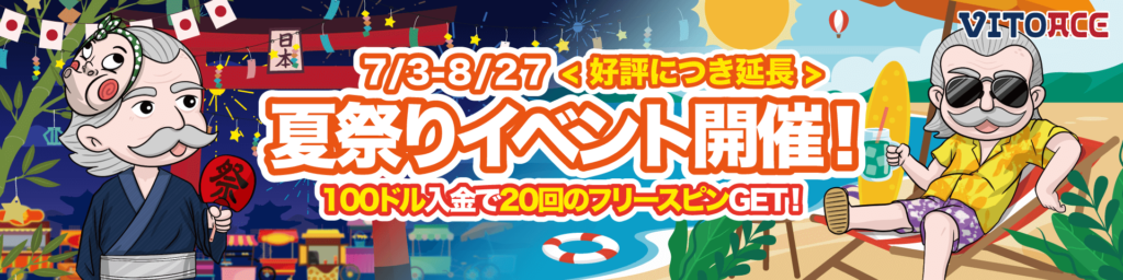 当日1回に$100以上のご入金につき、20回のフリースピンをご獲得いただけます。毎日1回ご申請可能です!さあ、ヴィトエースの夏祭りに参加し、夏気分を盛り上げ、一緒に夏を満喫しましょう!申請方法