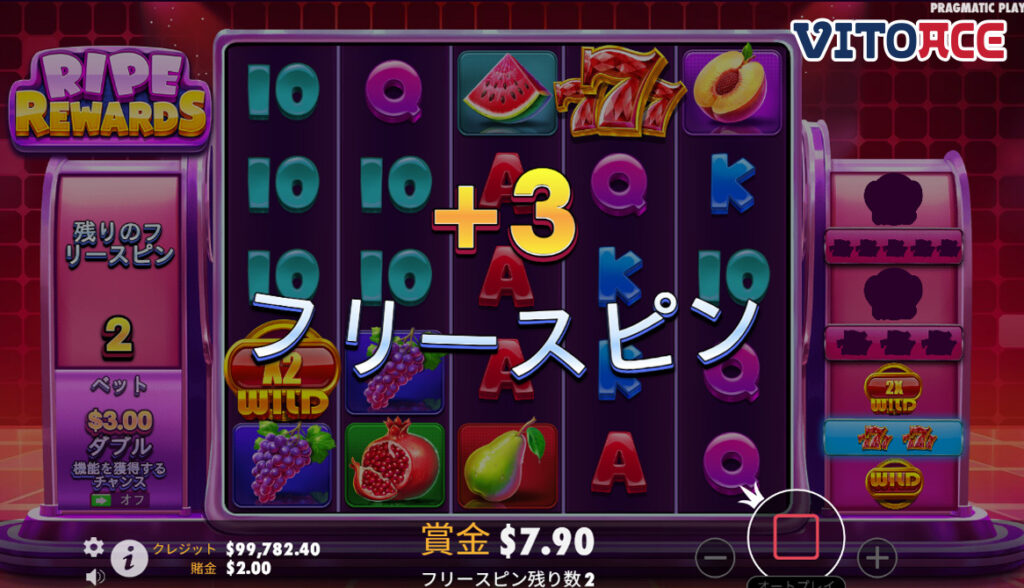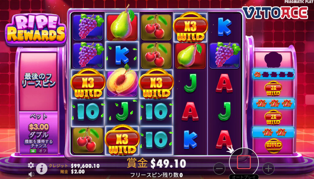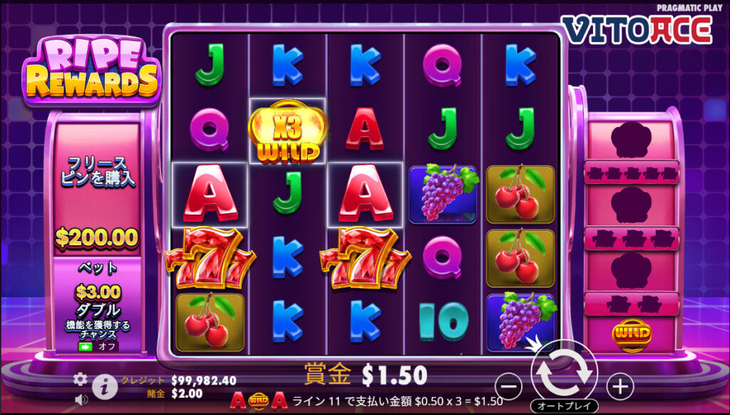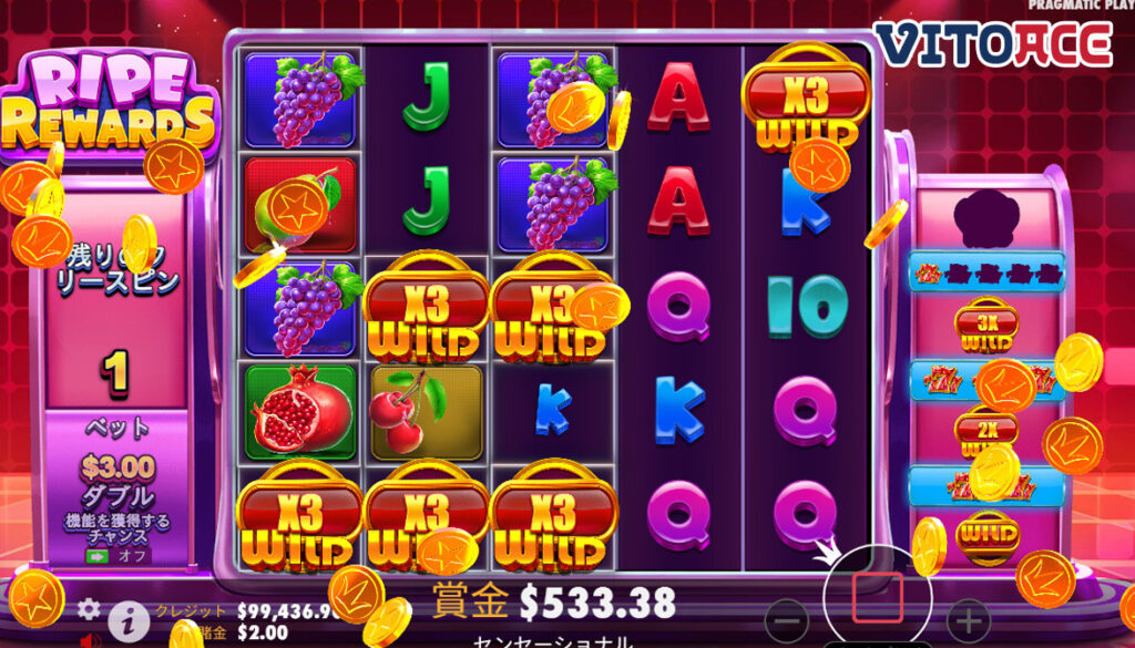 ライプ・リワード(Ripe Rewards)で通常回しからWILDシンボルが登場したら、配当成立時に賞金が与えられます。