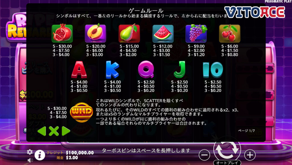 ライプ・リワード(Ripe Rewards)の配当表は以下の通りです。※デフォルトのベット額を表示しています。