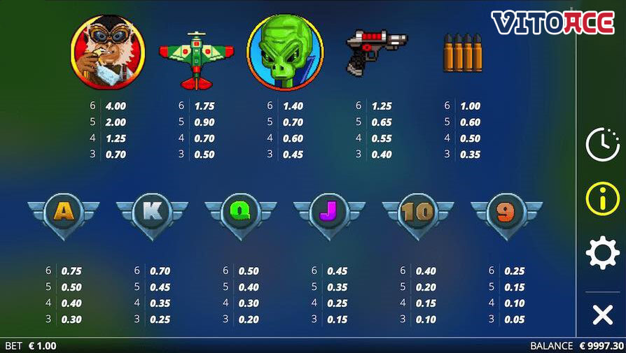 これは、Space Donkeyの賞金表と、潜在的にいくら勝つことができるかの紹介です。一番上の最大の賞から始めると、6つの「サル」で、賭け金の4倍を獲得できます。次に、賭け金の1.75倍を獲得できる「飛行機」があり、その次は賭け金の1.4倍を獲得できる「エイリアン」と賭け金の1.4倍の「銃」があり、最後は、6つ揃うと賭け金の1倍を獲得できる「弾丸」です、そして、低配当シンボルはトランプの数字「A・K・Q・J・10・9」です、ペイライン6で0.75~0.25を獲得。Space Donkeyの特徴