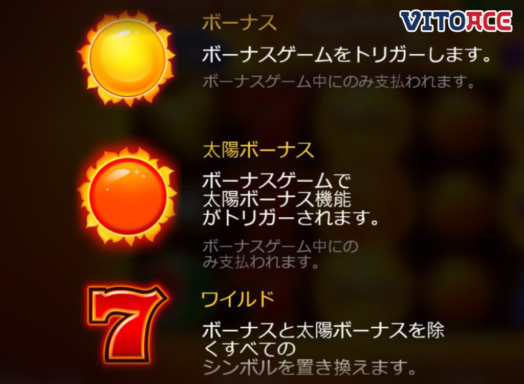 今作で追加された機能です。メインゲーム中に6こつ以下のボーナスシンボルが現れる場合、画面中の巨大な太陽に吸い込まれます。吸えば吸うほど、追加でボーナスゲームの発動率をアップできます!ボーナスゲームのジャックポット
