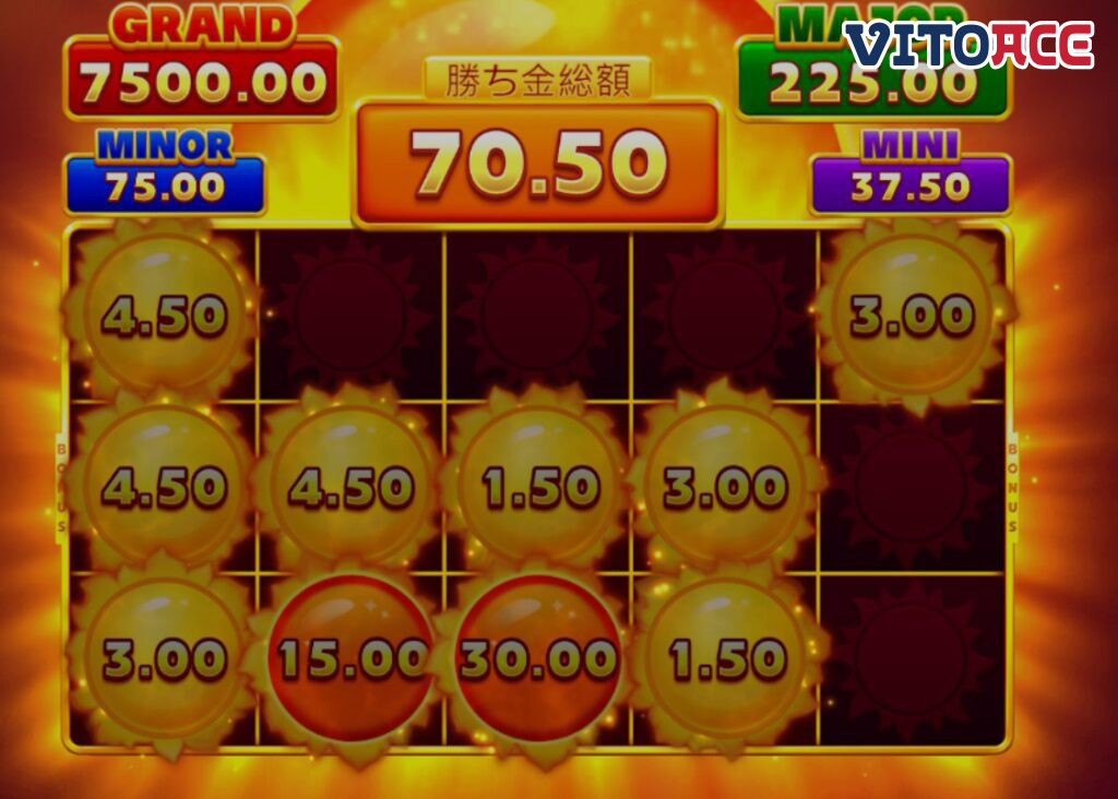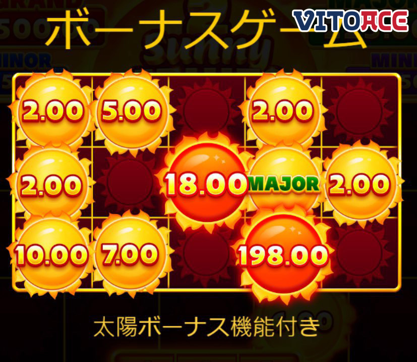 真赤な太陽が現れると、その時点でリールに表示された金額をすべて吸収して賞金を積み上げてそのまま残ります。(もちろん元の金額も残ります。倍増です!)また、複数の真赤な太陽が出た場合は、前の真赤な太陽の積み上げた金額をもう一回吸収し、もっとデカい太陽になっていきます!