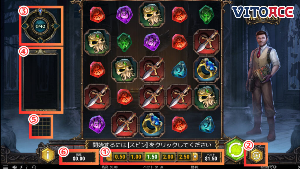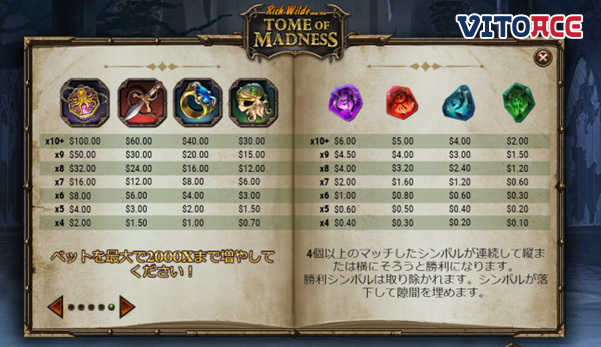 Tome of Madnessは、アメリカの小説に出てくる「クトゥルフ神話」をモチーフにして作成されたオンラインビデオスロットです。冒険家のRich Wilde教授が、古代の遺跡に眠る魔導書の謎を解き明かし、小説に登場する「神話の怪物クトゥルフ」を降臨させるゲーム性になっています。Play’n GO社のスロットは、どの機種もストーリーに沿って作られていますが、Tome of Madnessは、5年前に作成されたスロットとは思えないほどのクオリティになっています。スロットを起動したときに流れるセリフも世界観に引き込まれるような音声になっていますよ!(ただ、筆者は英語が苦手なので、何を言っているのかはわかっていませんw)Tome of Madnessの配当表