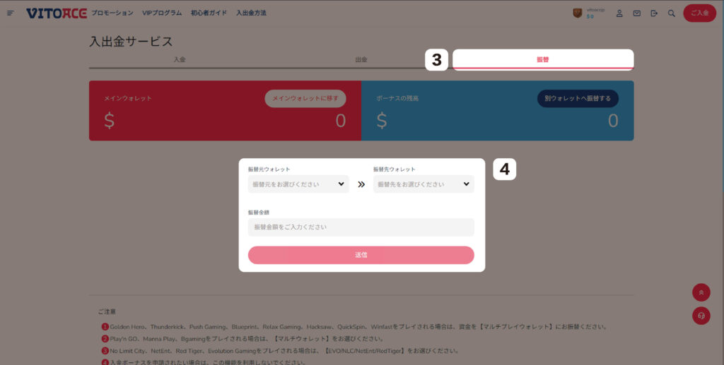 残高をメインウォレットから、利用されたいプロバイダーのゲームウォレットに移動していただければ、ゲームをプレイすることができます。