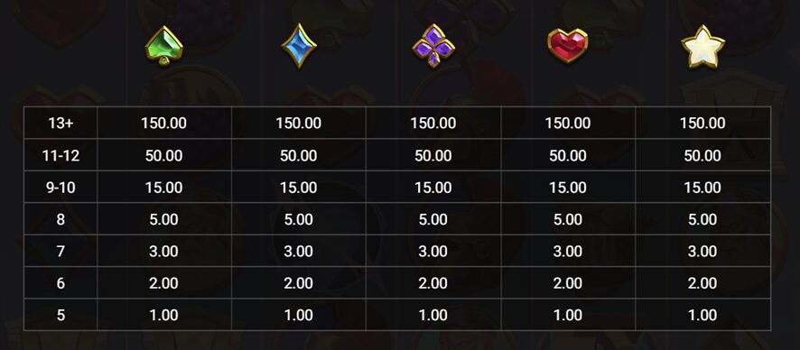 フリースピンに突入すると、同一図柄が5つ以上隣接すると勝利金を受け取りさらに消えた箇所の後ろのマスがハイライト化されます。